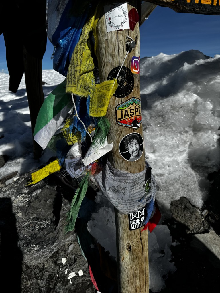 We reached Stella Point at 7:12am, the day had already broken, the sunrise came as we closed in on that landmark, we were moving forward, and I lifted my gaze from the ground to see the sun and the blaze orange and pink sky. I took a moment and took a zen photo, and in our shared folder of pictures there is one actual picture of this sky from Karen, a trekker from the UK. The actual picture does not translate the magnificence of the sky in my zen photo. A brief rest and we headed to Uhuru Peak, about an hour trek to the highest peak in Africa. We reached the summit at approximately 8:36am on the morning of January 31st. The sign was already littered with hikers taking pictures, we waited our turn, got the prerequisite picture with the sign then hiked up onto the glacier for one last picture. At this point I wandered off and found a small hole with a rock protruding and pulled from my pocket a small container of Rob’s ashes and left them on the glacier surrounding the small lava rock formation. I did this in Iceland too, leaving a small amount on the black pebble beach. He wasn’t a traveller or an adventure seeker unless there was a Donzi or motorcycle involved, but for me leaving a piece of him in these places felt cathartic.
